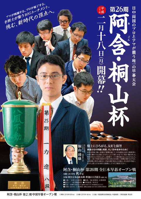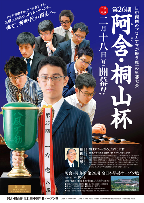 阿含・桐山杯開幕 第26期 全日本早碁オープン戦日中両国のプロとアマが競う唯一の早碁大会盤上にひろがる、友好と叡智囲碁文化の飛躍と発展、そして日中友好のために平成31(2019)年2月18日(月)開幕決勝:2019年 秋予定決戦会場:阿含宗本山総本殿・釈迦山大菩提寺(京都)予定
